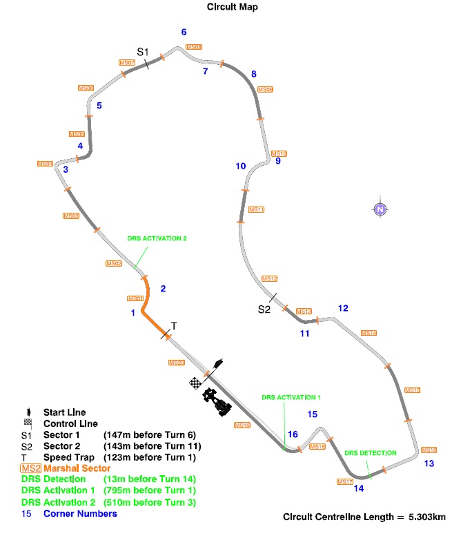 Límites de velocidad en Pit: 60km/h en las sesiones libres; 100km/h durante calificación y carrera - 15 curvas en total, mezcla de lentas, medias y rápidas